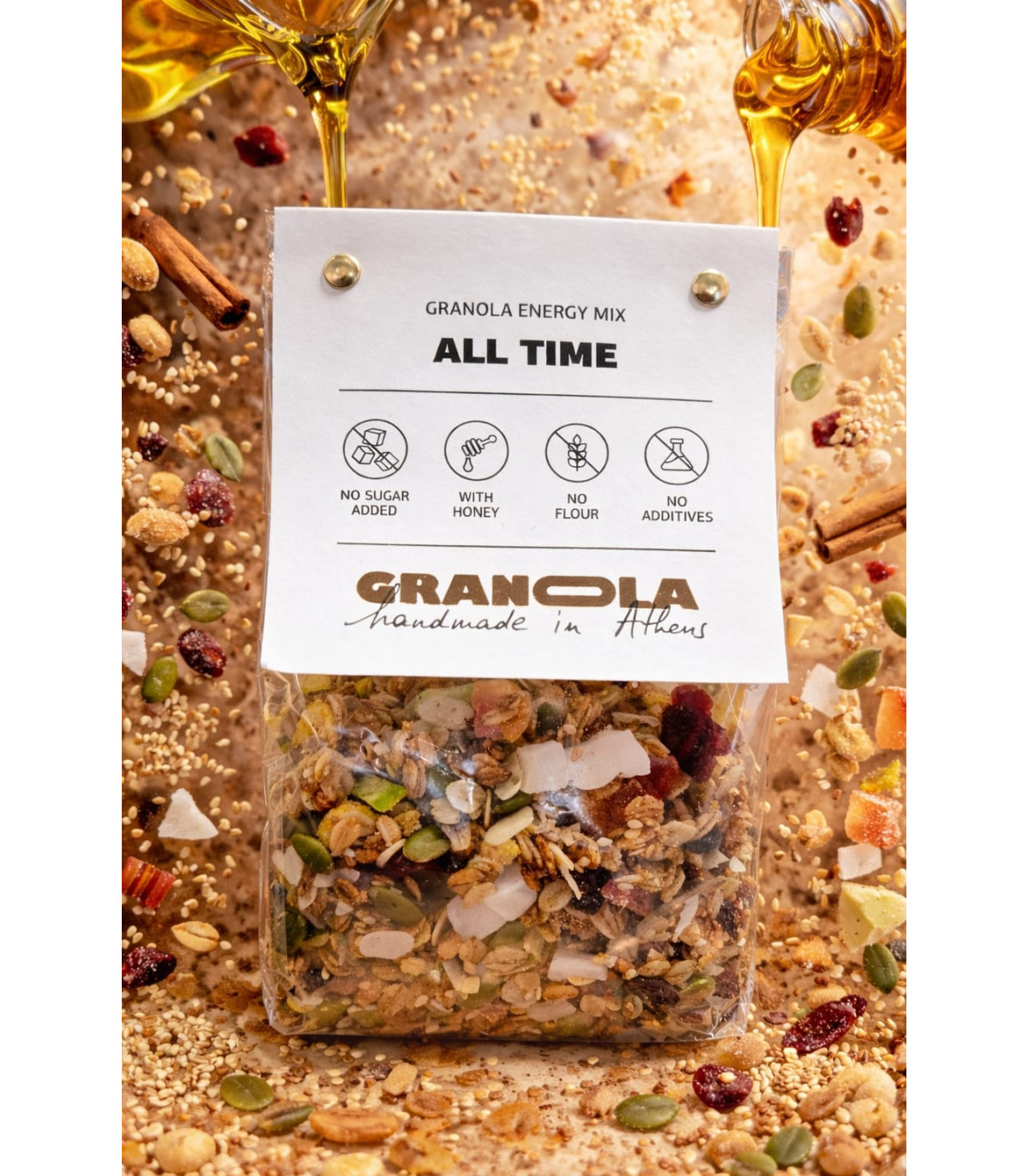 Zloženie: Obilninový základ, med, olivový olej, sezam, škorica, soľ, vanilín, brusnice, tekvicové semienka, sušená papája, kokos, pomelo, arašidové vločky. Môže obsahovať stopy orechov, sezamu a
