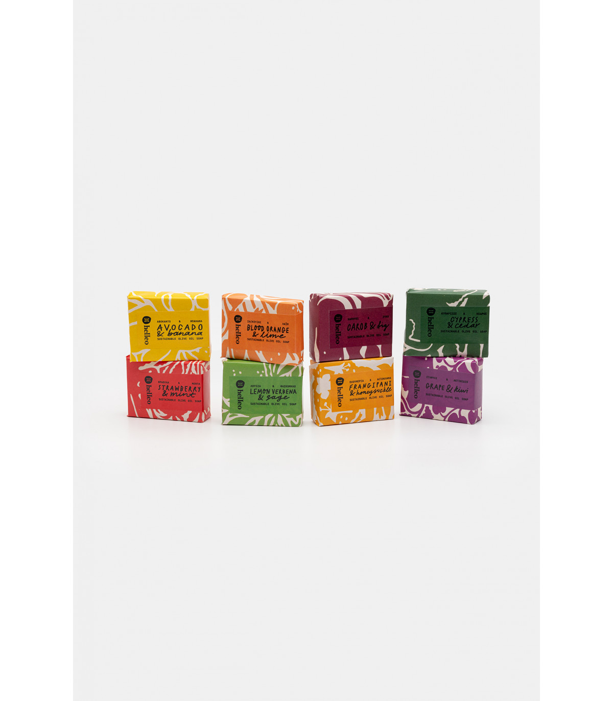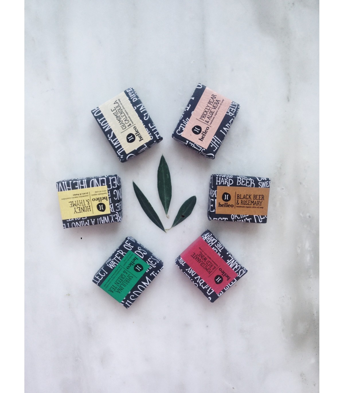 Helleo predstavuje 6 zmesí 100% prírodných olivových mydiel a 5 zmesí 100% prírodných všestranných vôní. Každá zmes má svoju silnú osobnosť a vyrába sa za studena v malých dávkach z organických a iba miestnych surovín, ako je extra panenský olivový olej, tymiánový med, červené víno, čierne pivo a divoké bylinky. V obaloch sa používajú iba recyklované materiály, zatiaľ čo odpad je takmer nulový.